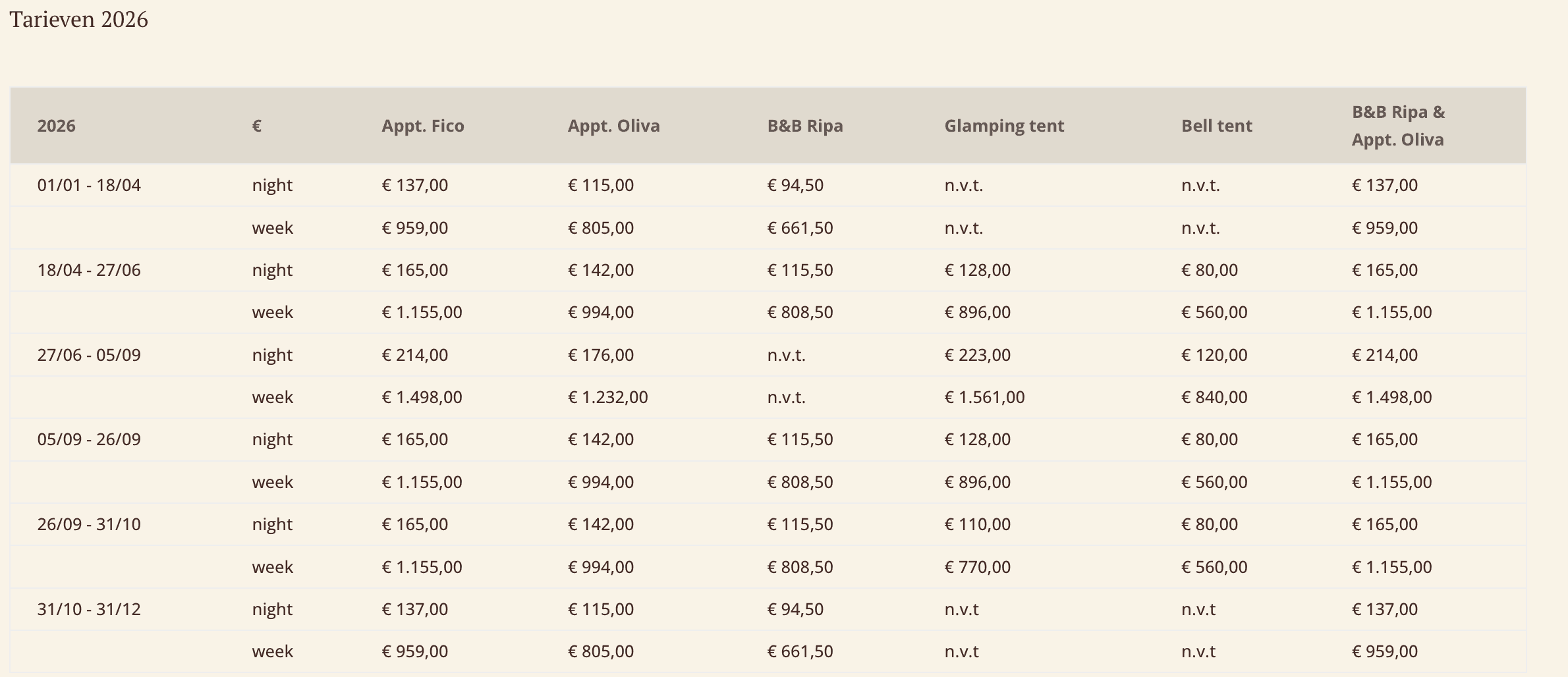 | 2026 | € | Appt. Fico | Appt. Oliva | B&B Ripa | Glamping tent | Bell tent | B&B Ripa & Appt. Oliva |